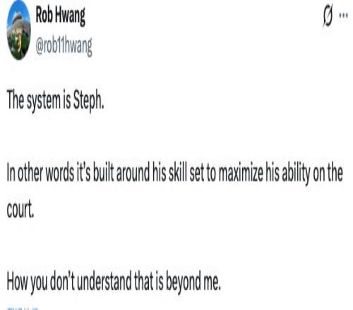 Rob Hwang说:“勇士的体系就是库里,换句话说,换句话说,整个战术体系都是围绕他的技术特点打造的,只为最大化他在场上的统治力。我真不明白这有什么难理解的。”