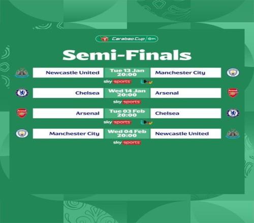 英格兰联赛杯1/4决赛战罢,半决赛对阵随之出炉。卫冕冠军纽卡斯尔联对阵曼城,首回合1月13日(周二)纽卡主场,次回合2月4日(周三)曼城主场;阿森纳和切尔西则上演伦敦德比,首回合1月14日(周三)切尔西主场,次回合2月3日(周二)阿森纳主场。